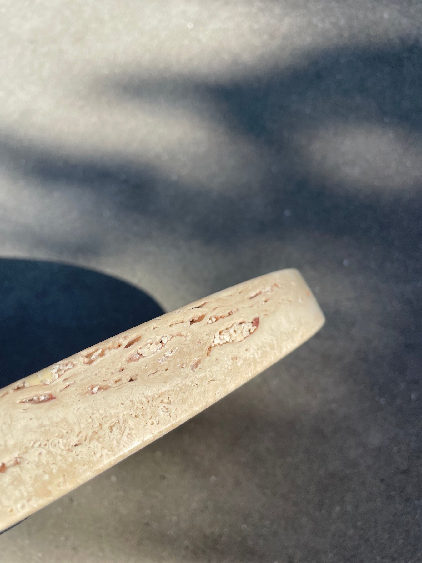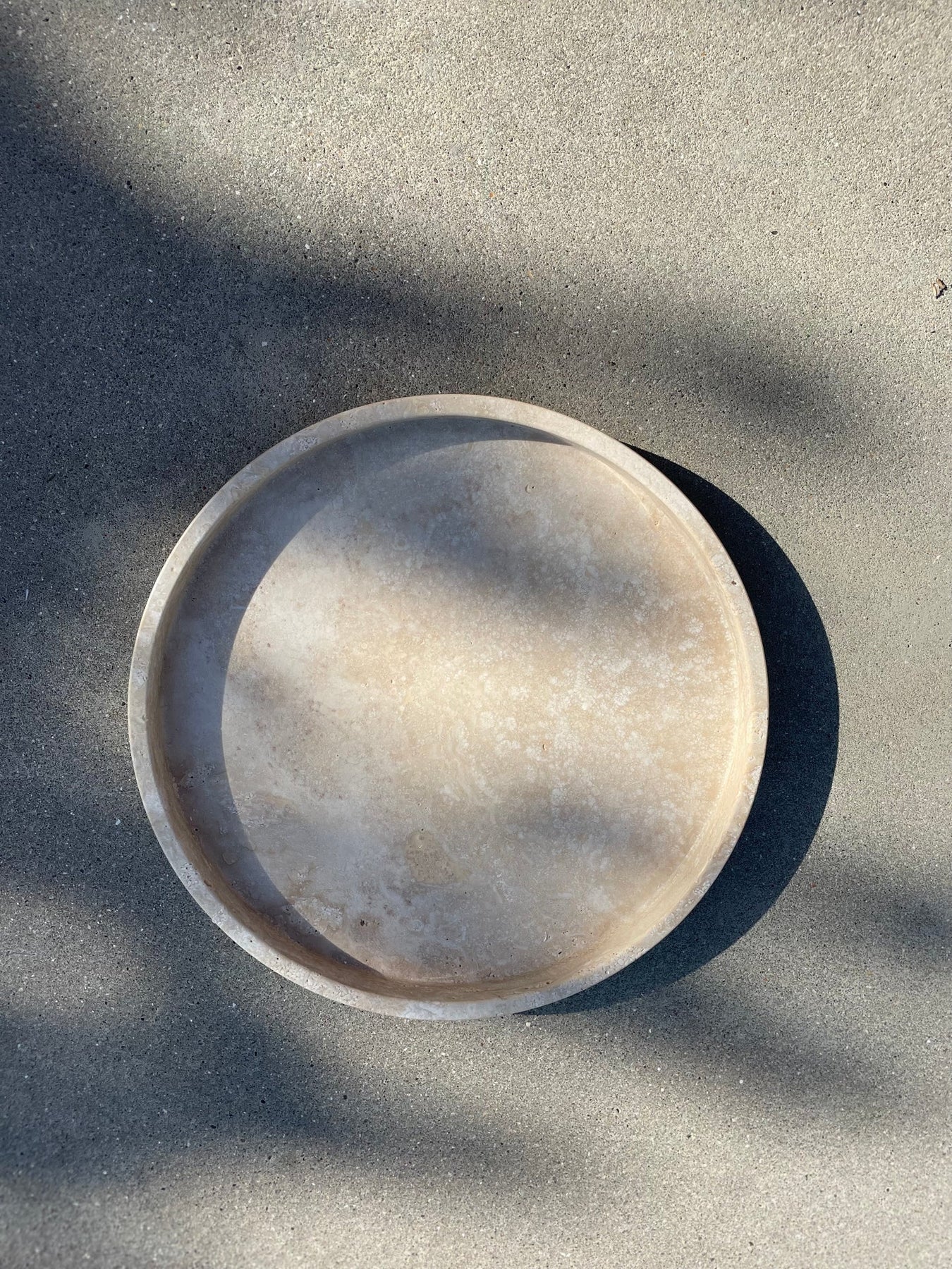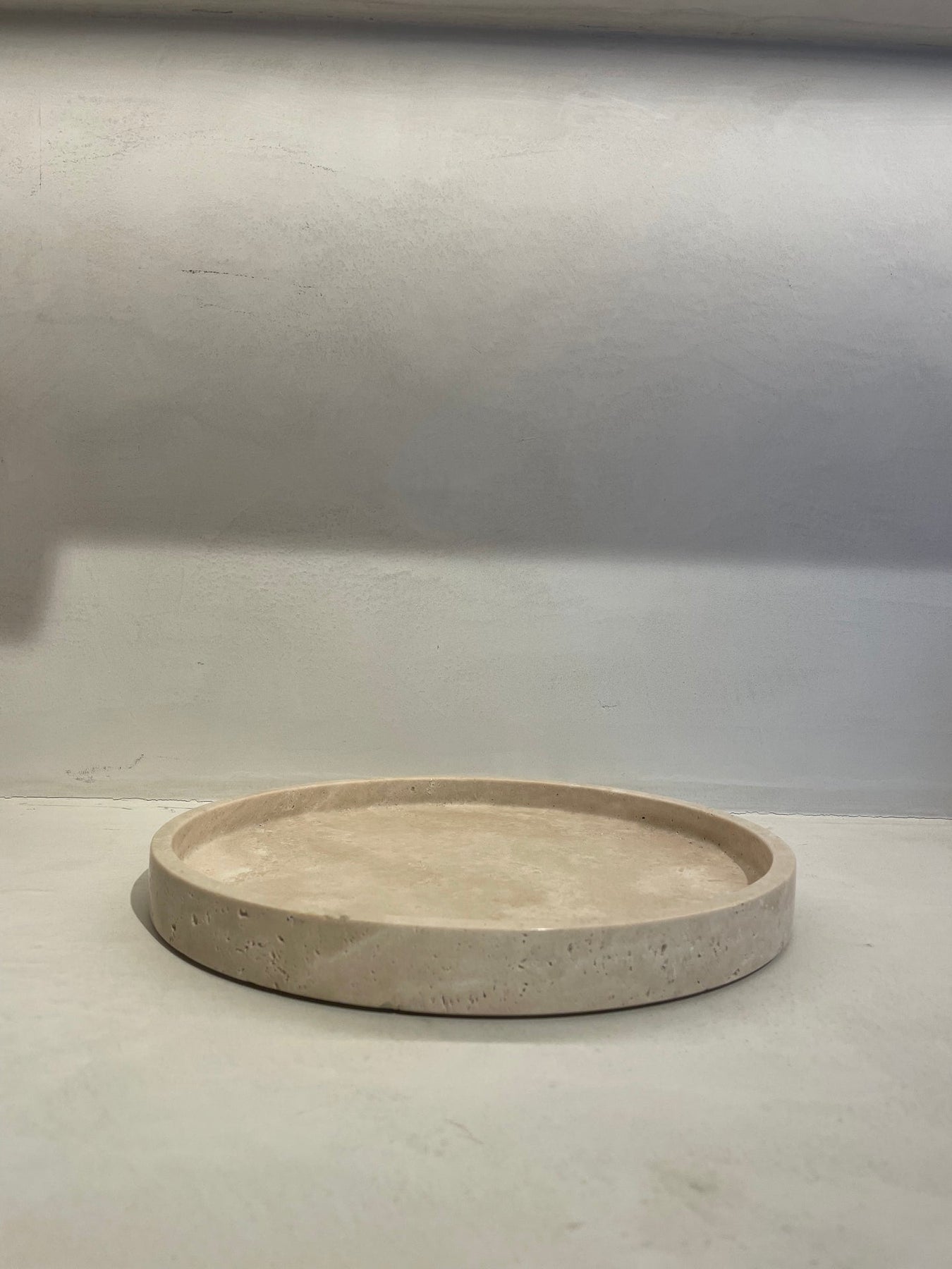 Pure vorm uit travertin met kleine opstaande rand. Travertin is natuursteen, kalksteen, die je kunt herkennen aan de typische kleine putjes in de steen. Die werden gevormd door kleine takjes, insecten,... De steen is ook lichtjes gewolkt door de vorming van de steen. Mooie, beige kleur in verschillende kleurtonen. Een prachtig stuk waar je jarenlang plezier aan zult beleven. Deze Travertin komt uit Turkije en elke kom wordt handgemaakt. De grotere gaten worden opgevuld zodat het product een egale uitstraling heeft.