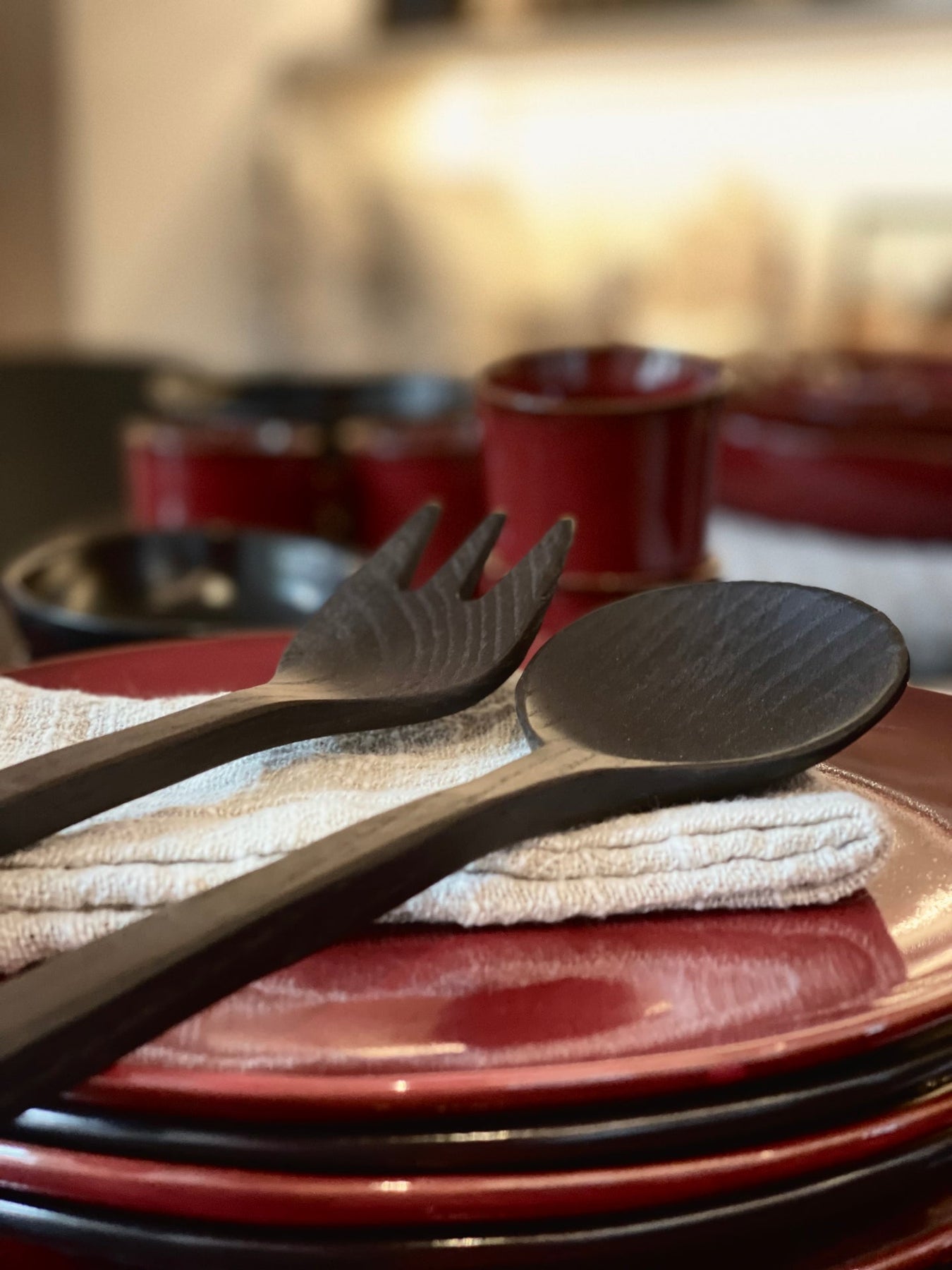 Saladebestek uit zwart essenhout. Niet vaatwasbestendig.